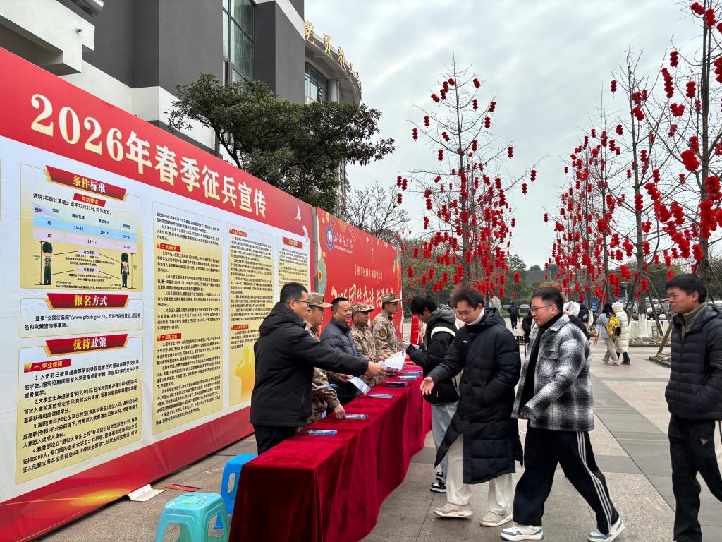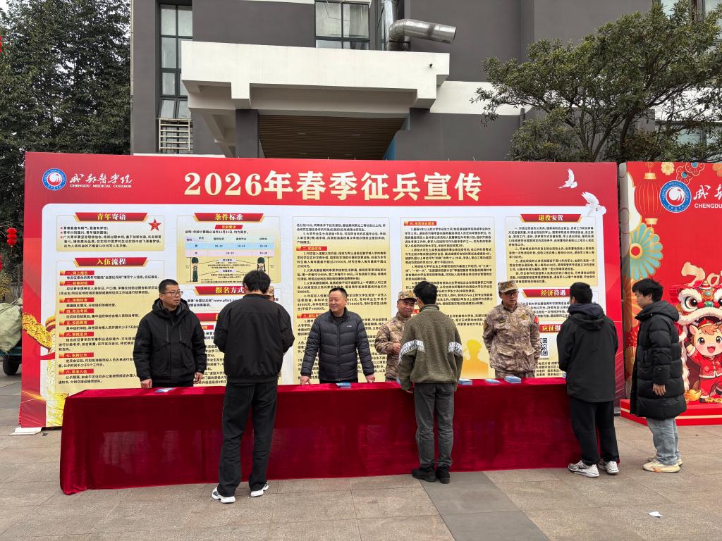 为有力推进2026年春季征兵工作,强化大学生家国担当意识,点燃青年投身军旅、报效祖国的壮志豪情,1月7日,学校征兵办联合金牛区武装部,在新都校区精心组织开展了征兵宣传活动。